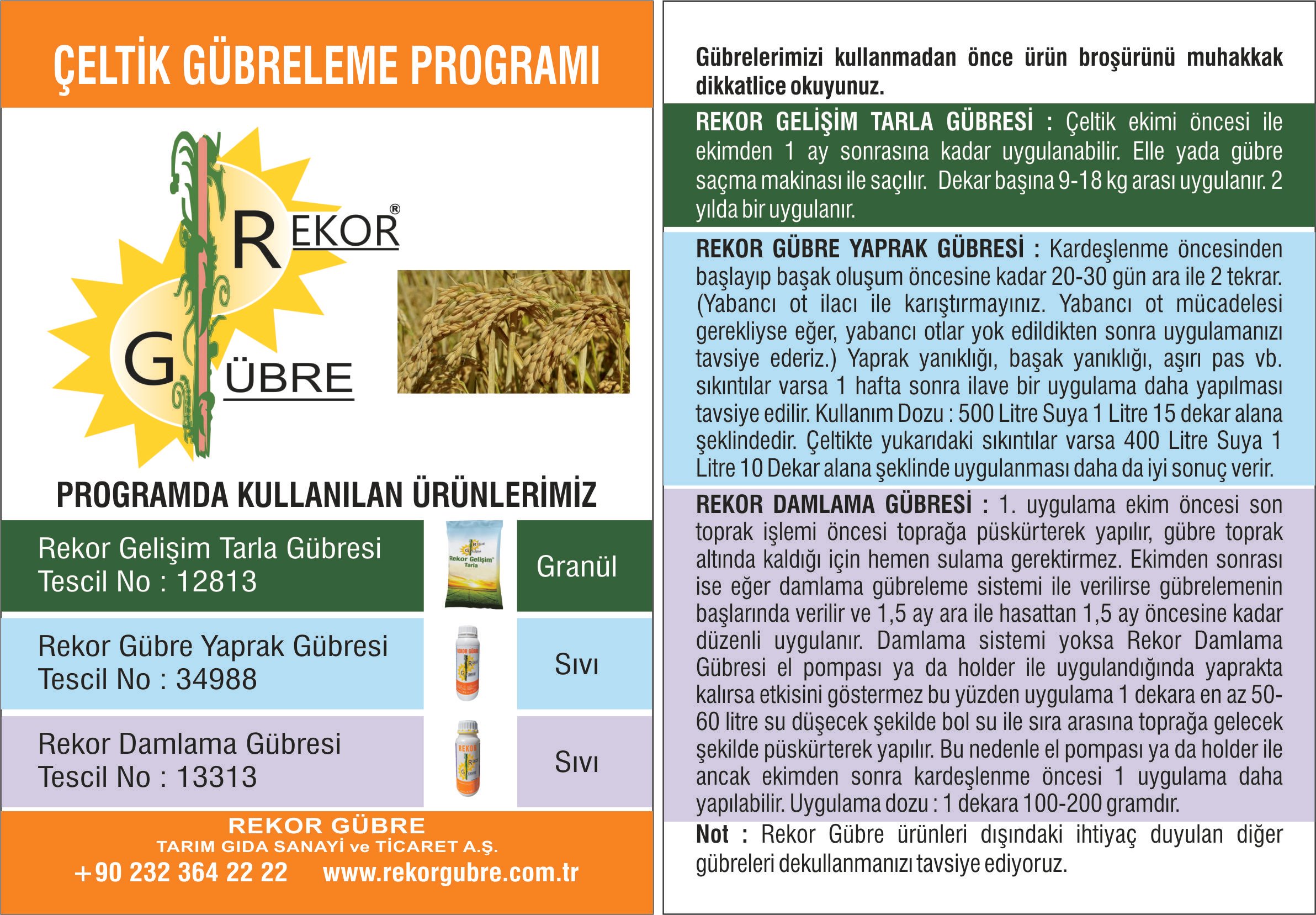 Yine yukarıdaki program da kullanılan gübrelerden çeltik ekimi aşamasında toprak altı kullanılan Rekor Gelişim Gübresi vardır. 2 yılda bir kullanılır. bitki gelişimi için son derece etkili bir gübredir. Köklenmeyi ciddi oranda artırır. Özellikle çeltiğin suyunu boşaltıp susuz kaldığı dönemlerde çeltiğin susuz kalmasından kaynaklı zararlarını minimize eder. Başak oluşmadan önce toprağa püskürtülerek yada kullanılan çeltik için sıvı gübrelerimiz vardır. program detayları yukarıda yazmaktadır. Bu gübreleme programı ile en yüksek verimi ve randımanı sağlayabilirsiniz, daha kolay ve sorunsuz bir çeltik tarımı yapabilirsiniz. Detaylı bilgileri de mesai saatlerinde 0232 364 22 22 den arayarak öğrenebilirsiniz.