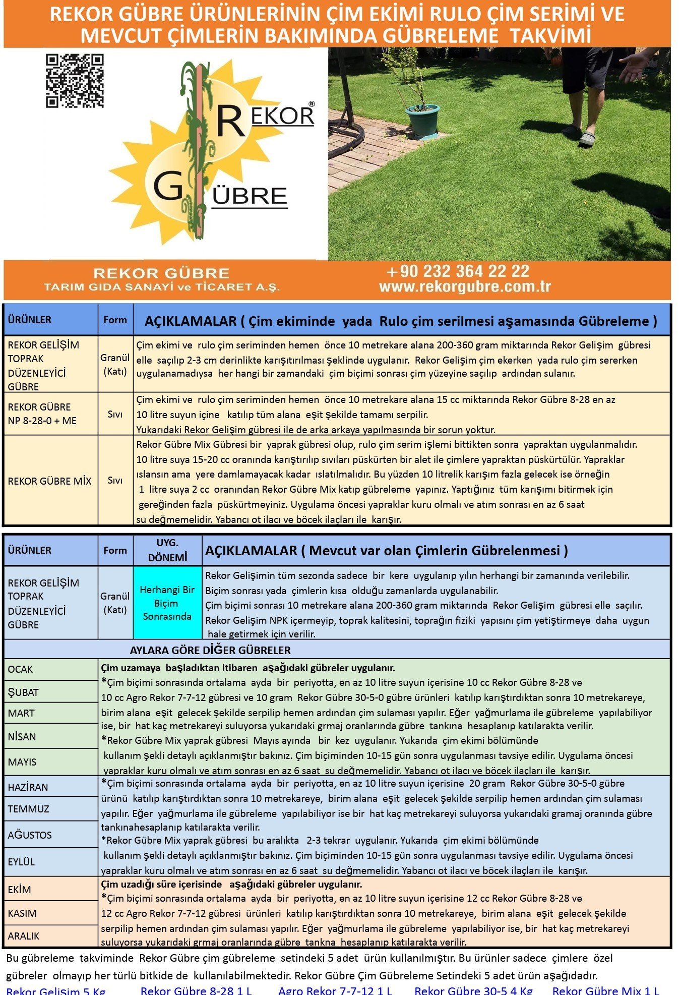 Burada çim ekimindeve rulo çim serilmesi aşamasında yapılması gerekli gübreleme işlemlerinden başlayıp, mevcut var olan çimlerin gübreleme takvimini en iyi şekilde hazırladık. Çimlerin Ocak, Şubat, Mart, Nisan, Mayıs, Haziran, Temmuz, Ağustos, Eylül, Ekim, Kasım, Aralık ayları dahil yani yaz, kış, ilkbahar, sonbahar mevsimleri dahil tüm mevsimlerde ihtiyaç duyduğu verilmesini tavsiye ettiğimiz gübreleri içeren Çim gübreleme programını hazırladık. Çim bitkisi ekildikten sonra çıkmasından itibaren sürekli sorunlar ile karşılacaktır. Bunun sonucunda çimlerde sararma, seyrekleşme, kuruma, aşırı yabancı ot çıkması vb. durumlar ortaya çıkacaktır. Çim bakımda en önemli konu toprağın fiziksel yapısının düzgün olması en önemli konudur. Bunun için zaten çim gübreleme takvimimizde Rekor Gelişim gübresini muhakkak kullanılmasını öneriyoruz. Diğer gübreler dediğimiz Azot, Fosfor, potasyum içerikli gübreler ve çinko, bakır, mangan, bor vb. mikro içerikli gübreler ise çim bitkisinin beslenmesi için gerekli gübrelerdir. Bunların tamamı da çim gübreleme programımızda hepsi yeteri seviyede, en uygun şekilde eklenmiştir. Çim gübrelemek için gerekli çim gübresi ürünlerini, sıvı çim gübresi, yaprak çim gübresi, yağmurlamadan springden verilen çim gübresi ürünleri kulllanabilirsiniz. Hangi ayda hangi mevsimde çim alanlarda metrekareye hangi gübre ne kadar gübre verilir, detaylı şekilde yazılmıştır. Çim gübrelemenin amacı çimlerin coşması vs değildir. Çimlerin seyrekleşmeden dengeli şekilde büyümesidir. Diğer taraftandan da çim tohumunun çeşidine göre olması gereken ideal renk tonunu yakalamasıdır. Ani sıcak ve soğuk hava şartlarında strese girmeden güzelliğini korumasıdır. Gereğinden fazla su istemeden yaşayabilmelidir. Yine aşırı yağış yada aşırı sulama vb. durumlarda da sağlığını koruyabilmelidir. İşte Çim gübreleme programımızda önem verdiğimiz konular bunlar olup çim bakımını daha sade, daha kolay ve basit hale getirmeye çalıştık. Burada çim tohumu çeşitlerinden bağımsız olarak her çeşit çim için uygundur.
