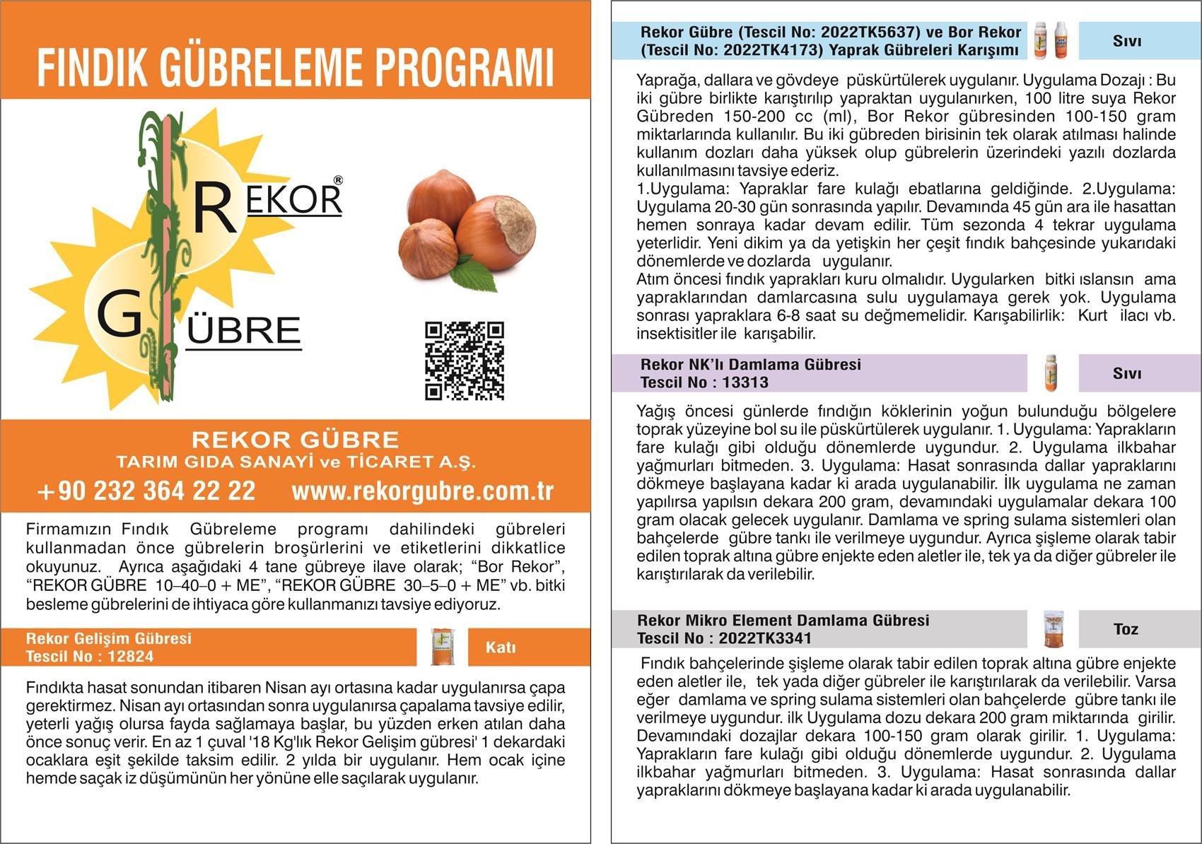 Tüm bu soruların cevabı için Rekor Gelişim, Rekor Gübre diyebiliriz. Yukarıdaki programdaki fındık için önerdiğimiz gübreleri kullanmanızı şiddetle tavsiye ediyoruz. Yıllardan beri sonuç alınmış Türkiye sınırları içerisinde en yüksek fındık bahçesi verimini ve fındık ocağı başı en yüksek fındık alınmış garantili bir gübreleme programıdır. Bu ürünler yokken eskiden ocak başı verim 1-1,5 kg insanlar tarafından kabul görülmüş makul verim olarak bilinirdi. Ancak Rekor Gelişim ürünleri ile ocak başı 10-15 kg gibi rakamlar konuşulmaya başladı ve bu sonuçlar alınmaya başlandı. Dekar verimleri 70-100 kg civarındayken fındık bahçelerinin verimi 500 kg rakamını geçti. fındık randımanları da aynı şekilde yükseldi. Eski tarihlere dönüp bakarsanız eğer bunları görebilirsiniz. Bereketli bir sezon diliyoruz.